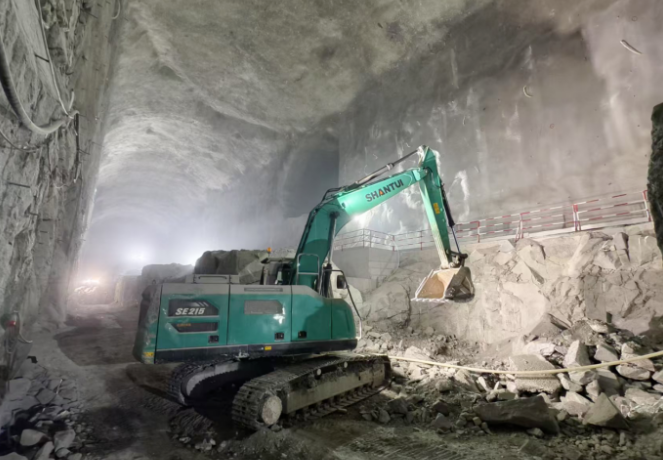 據介紹,該工程項目位于山東省中部,是國家規劃建設的重大能源基礎設施項目,總投資逾100億元,需開挖水道系統工程隧道2000米以上,以及引水系統斜井等高難度施工作業,地理環境多變,特別是隧道內施工,面臨著空間狹小、粉塵、潮濕等諸多挑戰。“隧道內施工,對挖掘機的通過性、操縱靈活性要求極高,這臺山推215電動挖掘機,日常操作動作順暢,連貫性強,尤其適合長時間高強度作業,幾乎無動力衰減,而且不需要更換濾網濾芯,即使環境惡劣也不怕,用著不僅省錢還省心?!蓖诰驒C操作手說道。